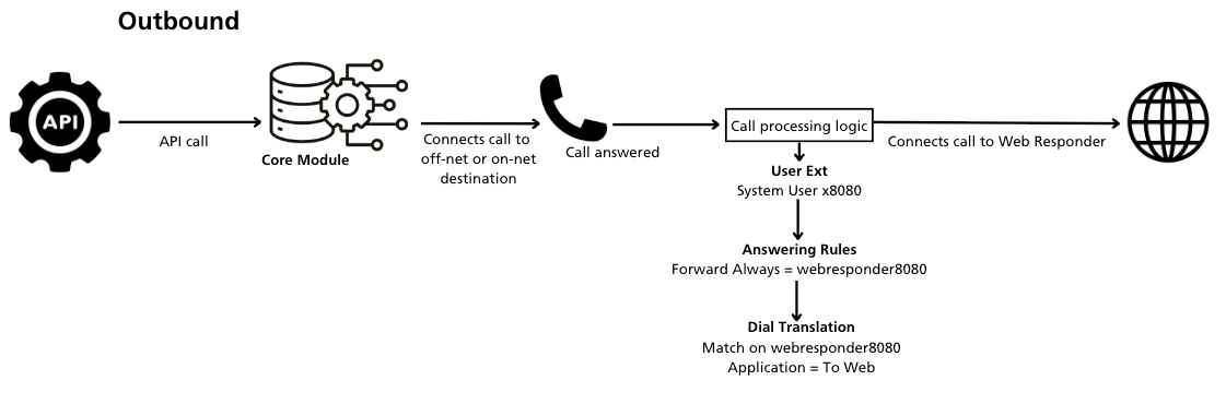 The process originates from a call, either from an endpoint or the API. The call is routed through the Core Module. Call Processing configurations then direct the call to the Web Responder. For example, the call may route to a specific system user’s Answering Rules and finally match via a Dial Translation to the Web Responder. The Web Responder contains an XML script allowing it to communicate actions with the Core Module.