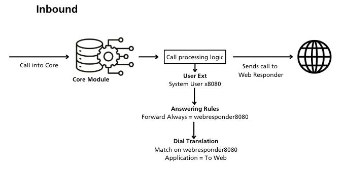 You can direct inbound calls to a Web Responder application by routing to a system user and then forwarding to a Dial Plan entry that selects the "To Web" application. To-Web specifies a single parameter, which is the URL of the Web Responder application. IVR flow control is then passed to the Web Responder application via that URL.